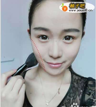 8为了让脸型变得更为立体小巧,用上修容粉从耳根刷到下巴。