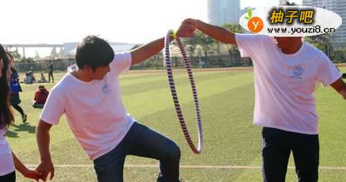 每次4个队伍一起比赛,裁判员分开记时。每组8人参赛。参与选手手拉着手围成一个封闭的圆圈,在其中一人手臂上套上一个呼啦圈,比赛开始时,各组同时运动,在不许用手的情况下,把呼啦圈穿过每个人的身体,总共传3圈,最先完成的一组获胜。