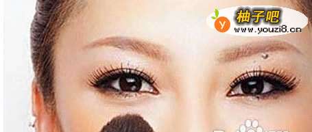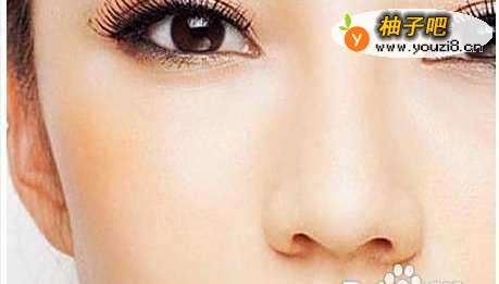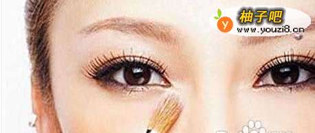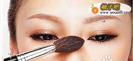 7小号的化妆刷,蘸取适量的高光粉,把它扫画在眼睛下靠近鼻梁的地方,目的是要突出妆容的层次感。