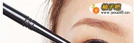 2浅棕色眼影画好后,使用黑色眼线笔,沿着上眼睫毛的根部,描画出一条黑色的眼线,并且在眼尾部分要适当的拉长。