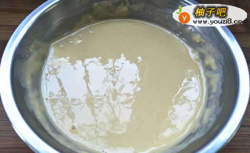 4和成面糊,稍微稠一些,将藕片从面糊里过一下,整个藕片都沾上面糊了。