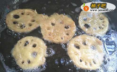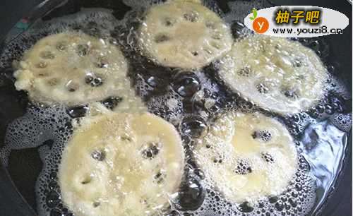 5下油锅,藕片要一片一片的过面糊,然后下锅炸