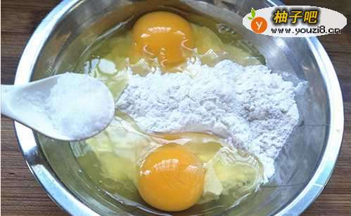 3将淀粉和面粉打入两个鸡蛋,再加1勺盐,少许清水
