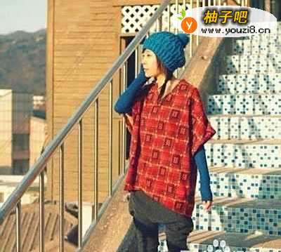 3第三种:明蓝色打底衫,搭配红色格仔V领罩衫,灰色萝卜裤,三色袜套,明蓝色毛 线帽。潮流又可爱!