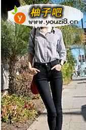 4第四种:淡色的简装衬衫,搭配紧身的黑色牛仔裤、米色平底小皮鞋,简单又大方, 且气质不逊于其它,轻便又干练,时刻透露着学生的青春活力。