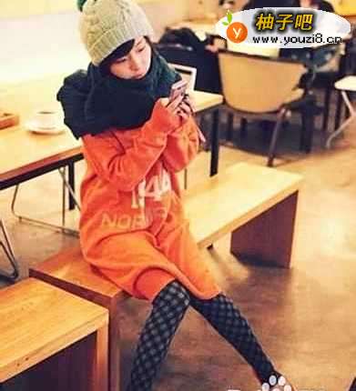 2第二种:橙色字母宽大毛衣裙,搭配黑灰菱形格仔紧身裤,米色与橙色拼接娃娃鞋, 墨绿色大围巾,米色毛线帽。热情又可爱!