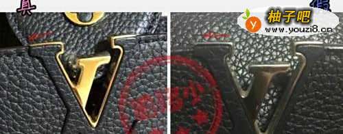 Capucines系列,最惹眼的就是包身正面的“LV”Logo,仔细观察它,可以帮助你分辨真假。正品“v”字最上端两侧的金属边,略向两侧末尾下沉,呈一个自然地弧度收尾。而仿品工艺粗糙,两端的金属呈直线状。