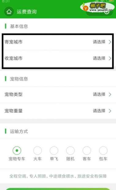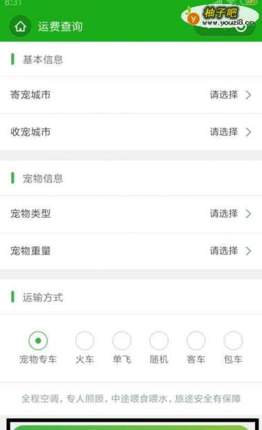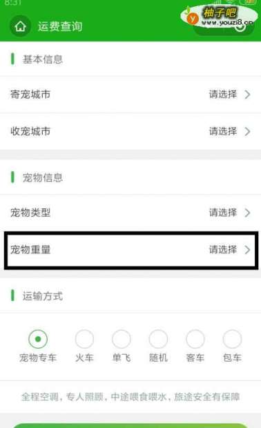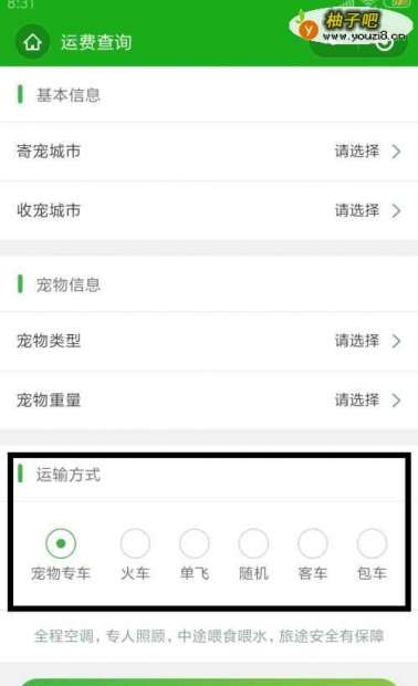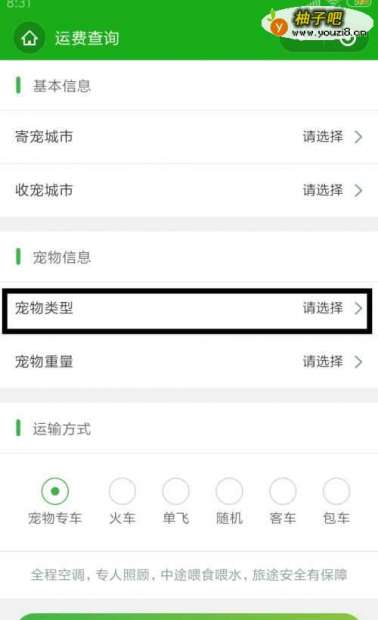5自动返回运费查询网页,选择运输方式,点击“宠物专车”或其他运输方式,如图黑色文本框: