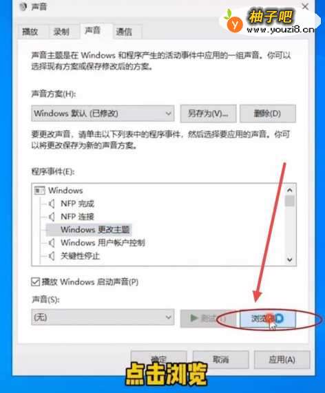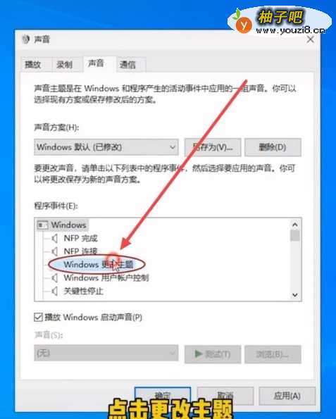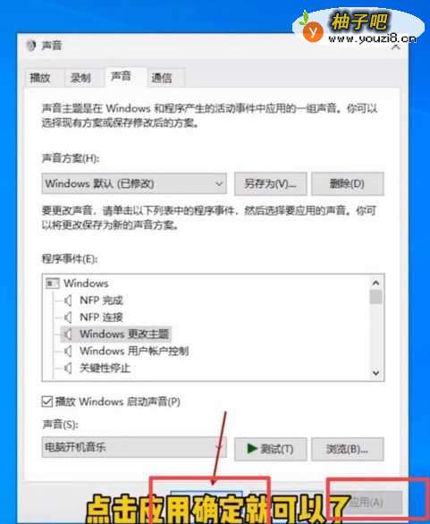 1.右键桌面右下角的扬声器;2.点击声音选项;3.勾选播放Windows启动声音;4.点击更改主体;5.点击浏览;6.选择自己喜欢的音乐点击打开;7.点击应用再点击确定就可以了。