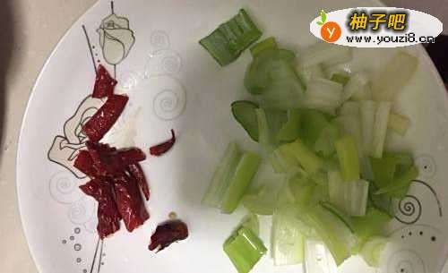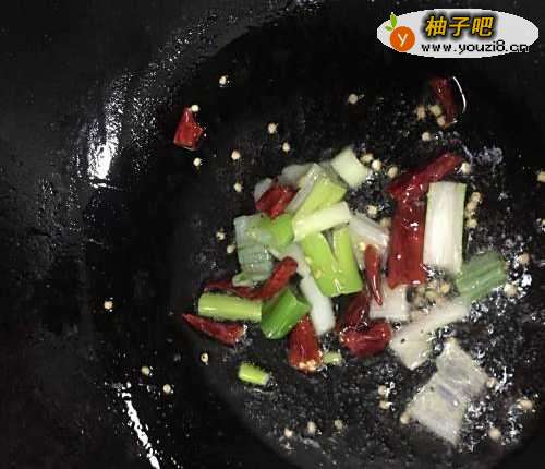 5炒锅中加入油,待锅内油热后,加入准备好的红辣椒和葱花爆炒1分钟;