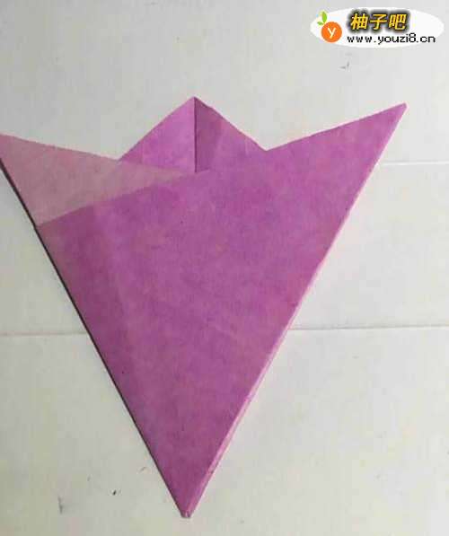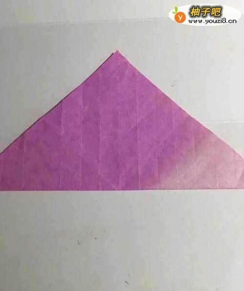 第一步 首先把一张16厘米X16厘米的正方形二红色彩纸 从下向上对角折叠整齐
