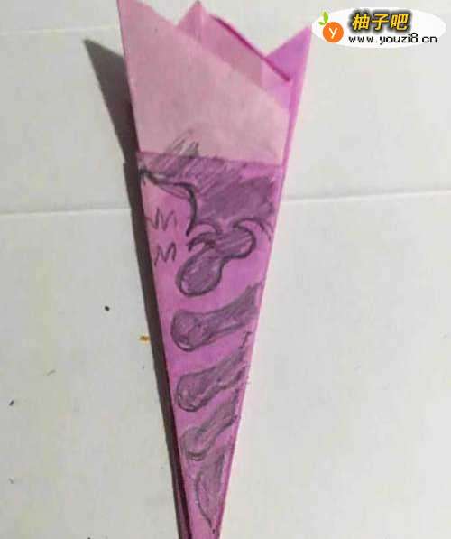 5第五步 折叠至背面之后 拿起绘图铅笔 画上半个九瓣花 再用绘图铅笔涂实一下需要剪去的部分