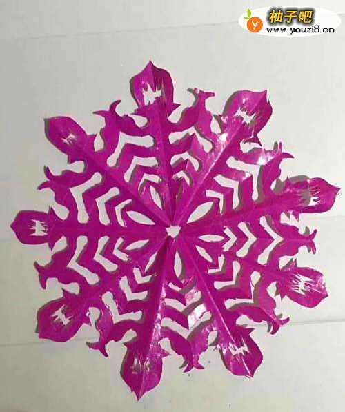 6第六步 涂实完之后 拿起手工剪刀开始裁剪 先剪里面细致的部分和镂空部位 还有其他涂实的部分 剪完之后取开铺平 一副漂亮的九瓣团花图案就裁剪完成了