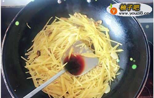 5土豆丝翻炒过后,加入少许的料酒、生抽,再加入适量的醋,接着继续翻炒就好了。因为是醋溜土豆丝,所以醋根据自己的口味多加一点没事,酸酸的才更好吃呢。