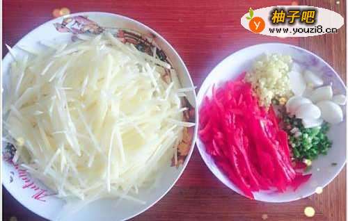 2处理食材:土豆切丝洗净备用、甜椒切丝备用、香菇泡发、葱姜蒜切好备用。因为土豆是属于淀粉类的,所以切好洗净后最好再放入清水中泡十分钟左右,这样炒出来才会爽口。