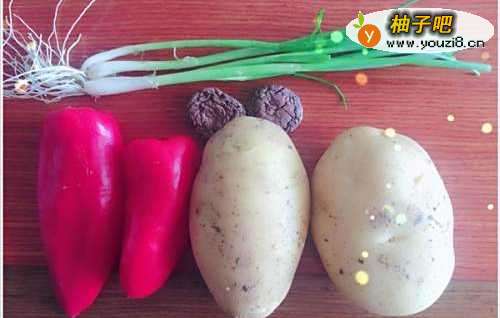 准备所需要的食材:新鲜的土豆两个、红甜椒两个、香菇两个和小葱若干。因为我这次买的甜椒是比较小的,所以放了两个,其实一个就差不多了。不喜欢吃香菇的也可以不放。
