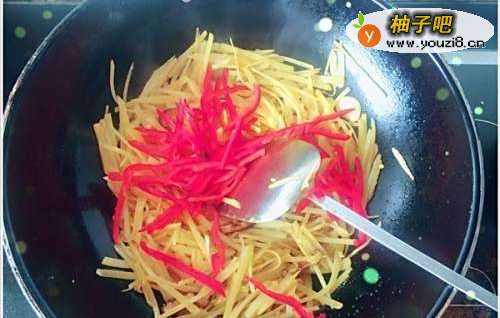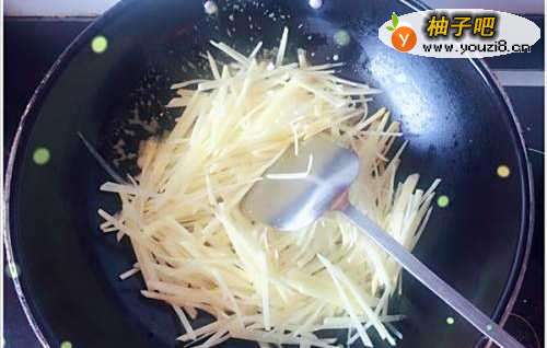 4然后放入事先准备好的土豆丝,不断的翻炒。土豆丝在放入锅里之前最好先控干水分,这样炒的时候才不至于粘锅。先不要急着加调料,先用油把土豆丝使劲的炒一会,这样才会好吃。