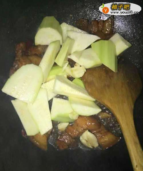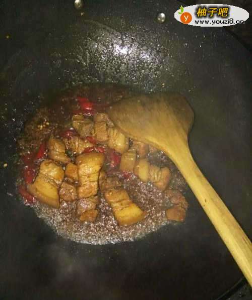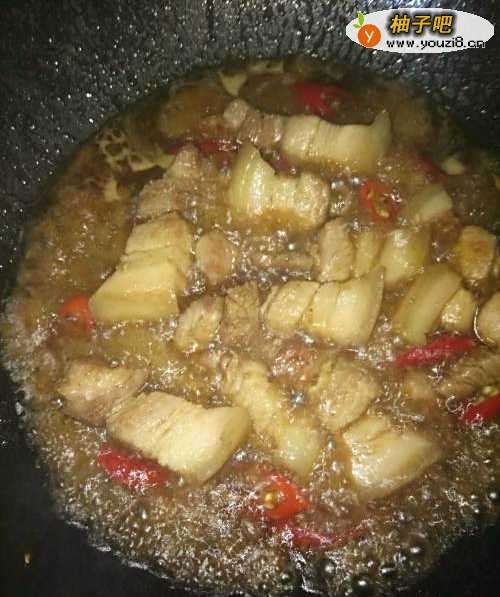 3继续煮,盖上锅盖卤煮,把五花肉煮烂;汤汁收汁后,再加少量料酒和水再次煮开;