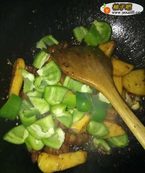 5将切成块状的青椒下锅里,翻炒均匀,翻炒到熟;再加入蒜头,炒香;