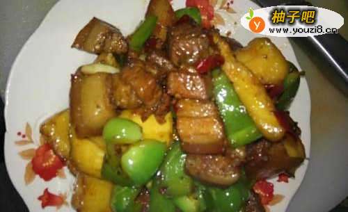 将所有原材料都洗好,切好;开火,将五花肉下锅炒出油,再下红辣椒;