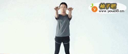①双脚与肩同宽,平行站立,呼吸自然。双手举至胸前,与地面平行,掌心朝下。