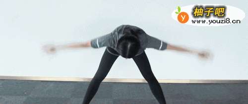 两脚分开站立,上半身前倾。双臂自然下垂,在体前做左右摆动的交叉甩手运动。幅度逐渐加大,连续做20~30次。