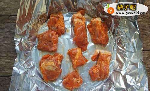 4烤盘铺上一层锡纸,将亮光面朝下,亚光面朝上接触食物,将腌制入味的排骨摆放在锡纸上。