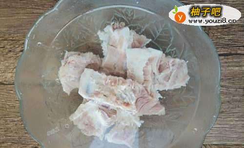 将排骨剁成小块状,清洗干净以后放入清水中浸泡半小时,泡出血水,中途记得换水一到两次,将排骨泡至颜色发白。