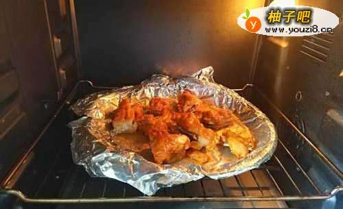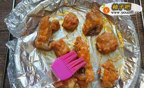 7时间结束之后,戴上隔热手套将烤盘取出,揭开上层的锡纸,小心被冒出的热蒸汽烫伤哦。在排骨表面刷一层腌肉料