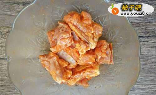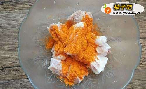 2将排骨捞出,沥干水分,放入2大勺新奥尔良烤肉料和1大勺料酒