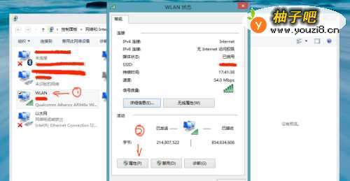4接下来分别选中你的WLAN适配器并双击(如下图“圈1”所示),双击后会弹出当前WLAN状态框,点击状态框下方的属性(如下图“圈2”所示)