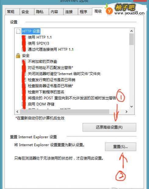 以IE浏览器为例,通过打开IE浏览器的设置-Internet选项后,点击“高级”标签栏,并按次序点击下图所示的“圈1”和“圈2“,遇到类似是否重置的对话框选择“是”即可,重置后重启电脑。