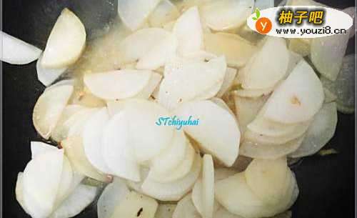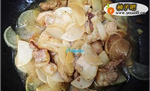 6将前面切好的白萝卜片放入炒制,电磁炉转大火,同时准备少许热水,翻炒一阵后加入前面腌制的腿肉,混合炒制。