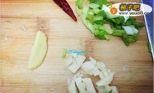 5准备辅料:生姜、蒜头、小葱、辣椒干,分别处理一下,生姜去皮切碎,蒜头拍碎去皮,小葱和辣椒干洗净切段,这些处理好后,放入锅中爆香一会。