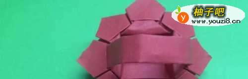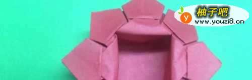 9最后取一张长方形纸条对折,把对折好的纸条镶进花瓣缝隙,花篮就做好了。