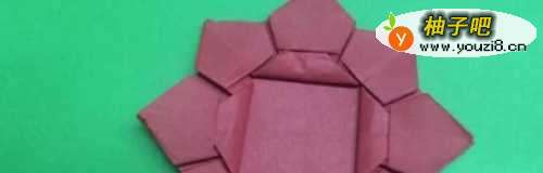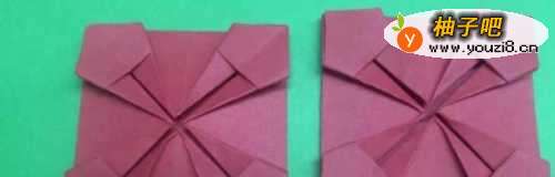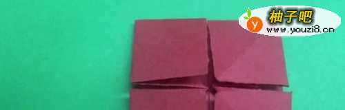 7其中一个剪成4个小方块,取一个小方块放入夹缝中——向上翻折——镶进缝隙,其它三个小方块按照前面的步骤折,完成下图所示形状。