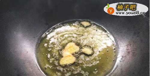 3炒锅烧热,加入菜籽油,菜籽油烧辣后,加少许姜片爆香。