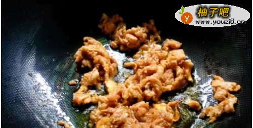 4将腌制好的鸡胸肉片倒入锅中大火翻炒至断生。