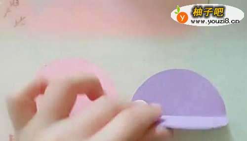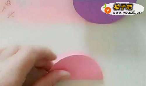 第一,去一张圆形彩纸,沿直径对折,具体操作如下图:
