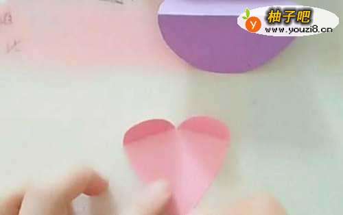 2第二,再取另一张圆形彩纸,同样沿中线对折,并如下图所示,在材质上画出一个半心形: