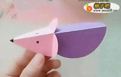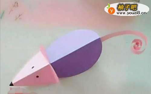7第七,再取一小块长长的彩纸,粘到老鼠的屁股后边,具体操作如下图所示,这样一只可爱的小老鼠就做好啦。
