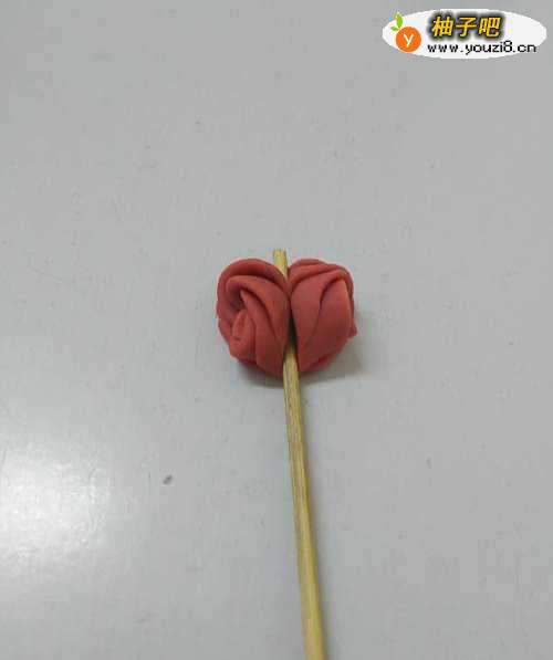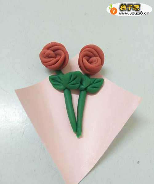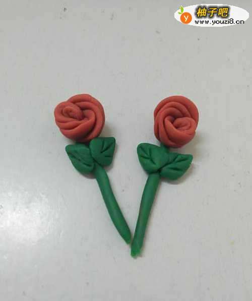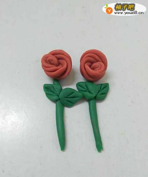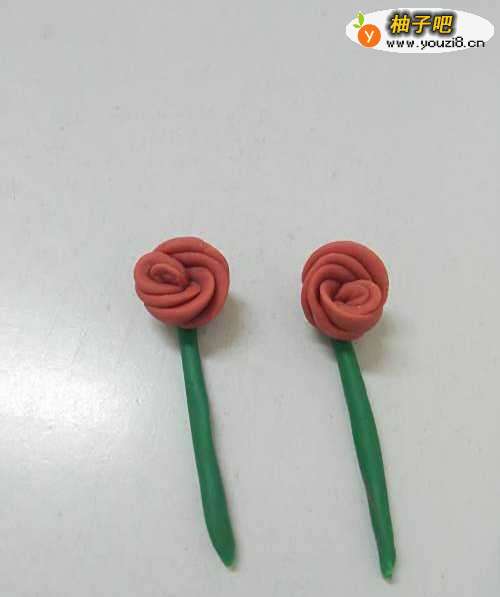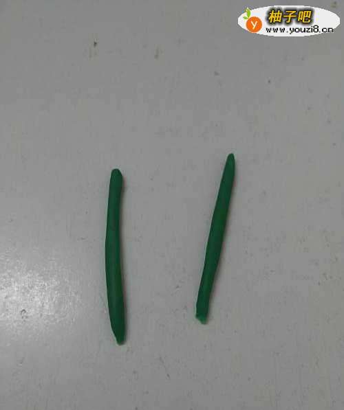 8用绿色彩泥搓两个一样长的小条,当作花茎。