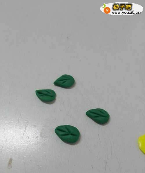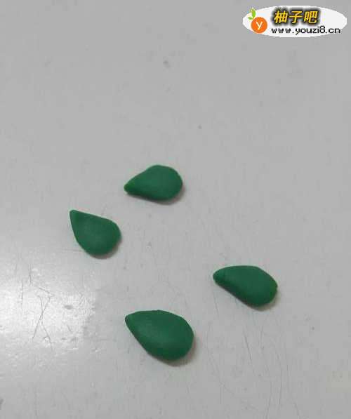 10用绿色彩泥捏四个水滴的形状,当作四片叶子。