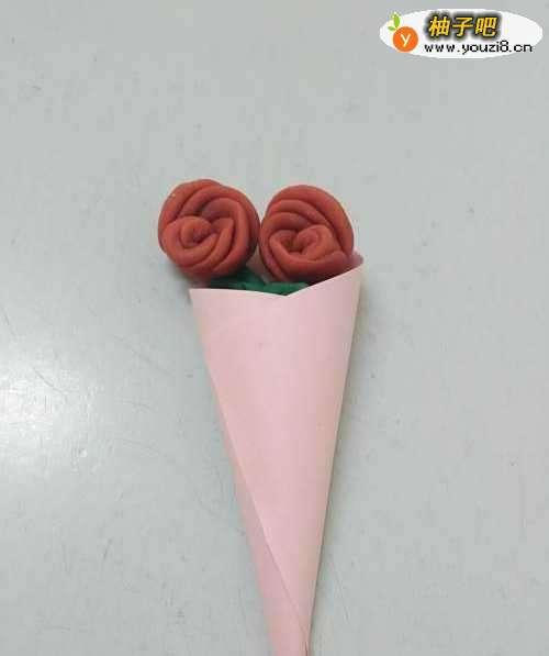 用彩泥捏几个圆片,卷成花朵,再捏出花茎和叶子,用方形彩纸包起来,做成捧花,特别好看,下面就给芭比做花。