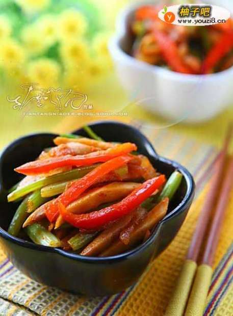 6再依次加入调味料,快速翻炒1-2分钟,最后加入红椒丝翻炒片刻即可。