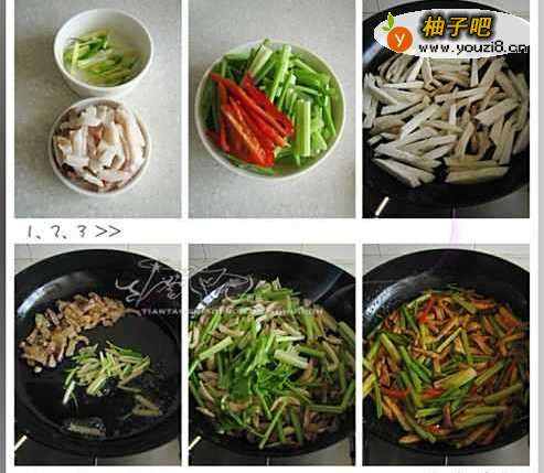 3锅入少油,加入杏鲍菇煸软身,盛出待用。4锅再入少油,将腊肉丝炒香炒透明,并炒出一些油脂,加入葱姜炒香。