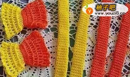 4现在我们开始做鞋面。先钩出4条鞋带(短针,15针,长短按照自己脚的大小而定,我35,19cm),再钩出2个蝴蝶结(长针,25针,两种颜色共9行),最后钩出2条绿颜色的,是用来固定蝴蝶结的。