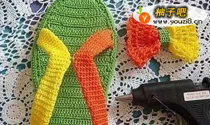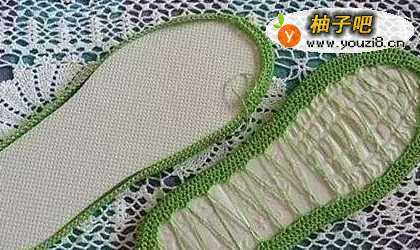 先钩出比鞋底稍小一点的毛线底(正面为长针,反过来钩短针),然后沿鞋底钩6圈短针(最后一圈每10针减1针)。