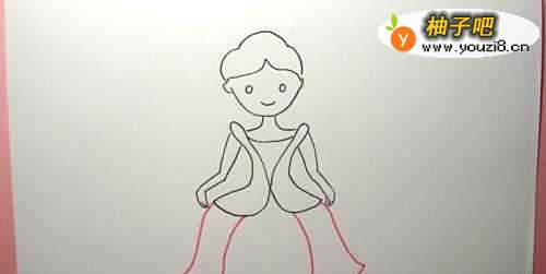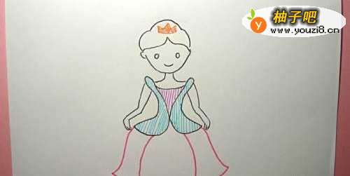 3然后,用粉红色彩色笔画出美丽的小公主的裙子的部分,注意绘画的曲线要流畅,如下图所示。