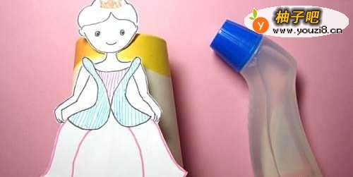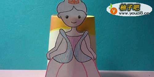 6最后,在剪出的图形,涂上胶水,根据纸杯的高度,把美丽的小公主图形粘贴在纸杯上,并把纸杯美丽的小公主立起来,如下图所示。这样一个好看的纸杯美丽的小公主就做好了,大家也来做做吧。